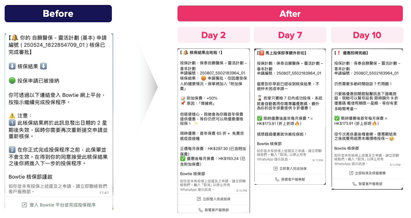 Developed 20 tailored automation workflows segmented by customer behaviors and opt-in preferences using Sleekflow (WhatsApp API) and Bowtie's Admin Portal.