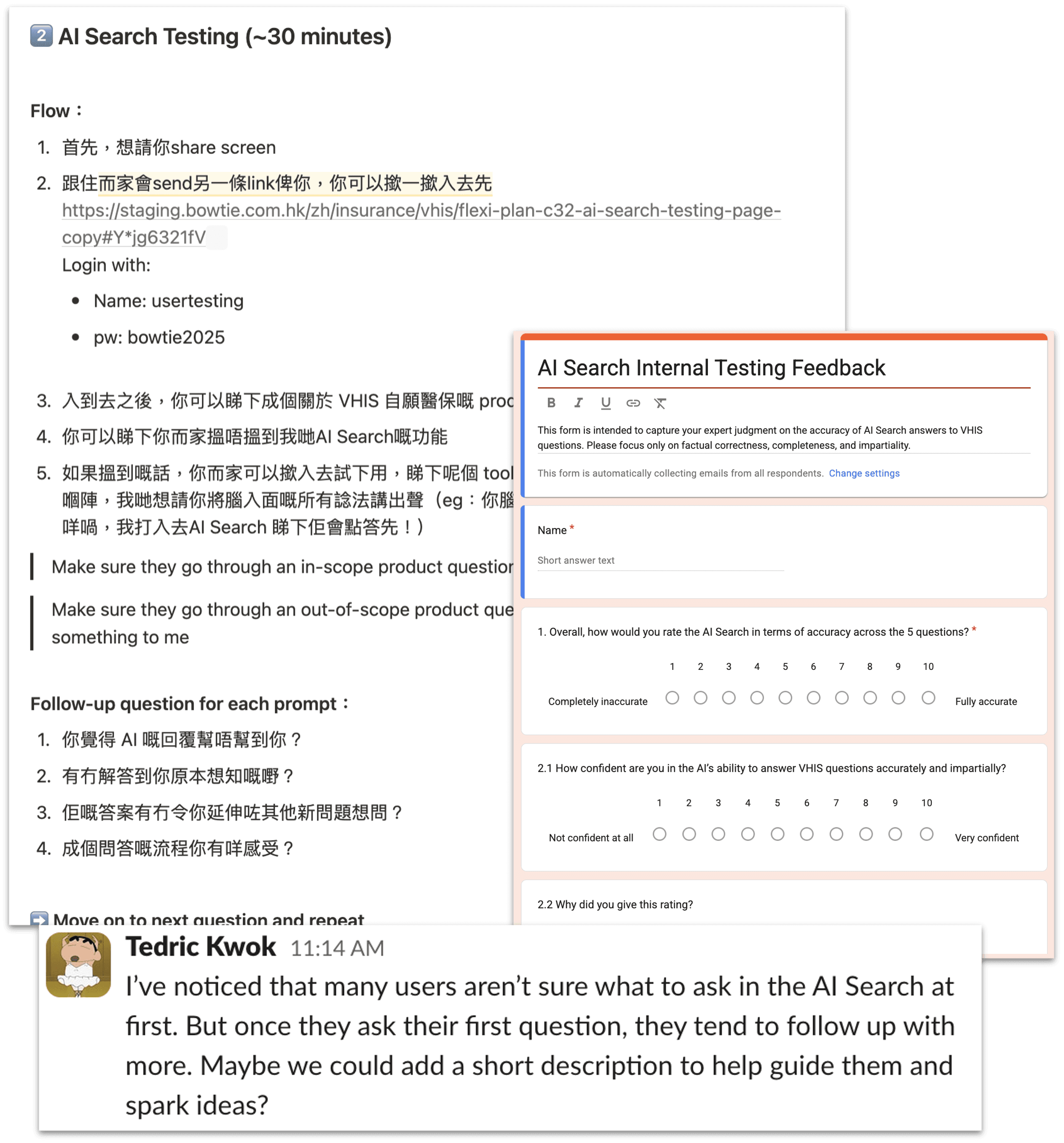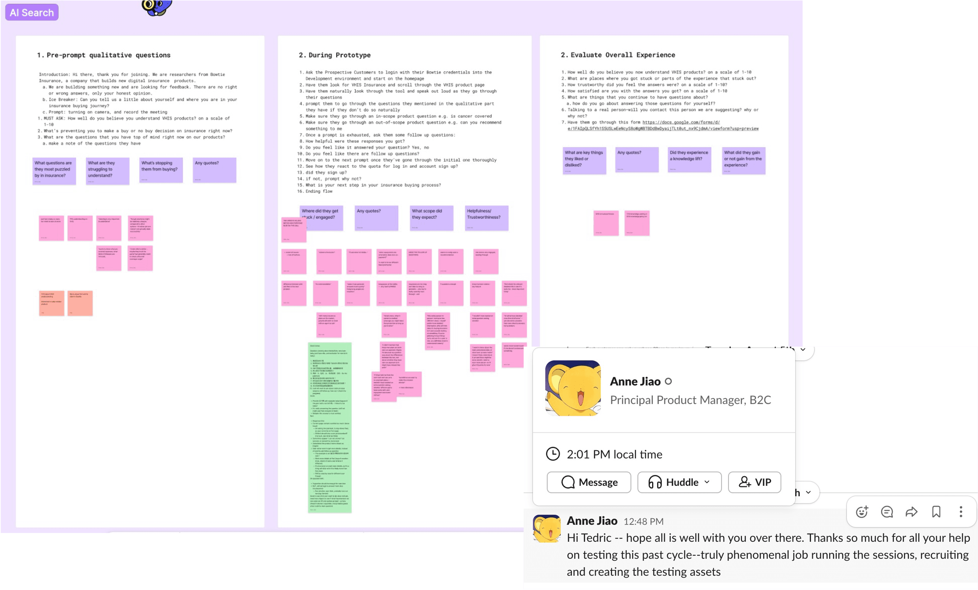 Leading user interviews for the AI Search project greatly improved my research skills. I handled participant recruitment, designed interview scripts, and moderated live sessions—even when unexpected issues arose. These experiences taught me to guide conversations smoothly, adapt quickly on the spot, and extract deep insights for actionable improvement